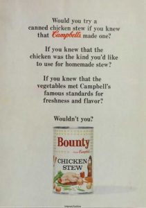 Introduced in the mid-1960s, this stew is no longer available. However, Campbell’s website offers a recipe for a similar stew using their current cream of chicken soup.